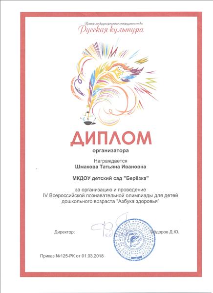Диплом. Организатора. 4. Всерос. поз. олим. для дет "Азбука здоровья"